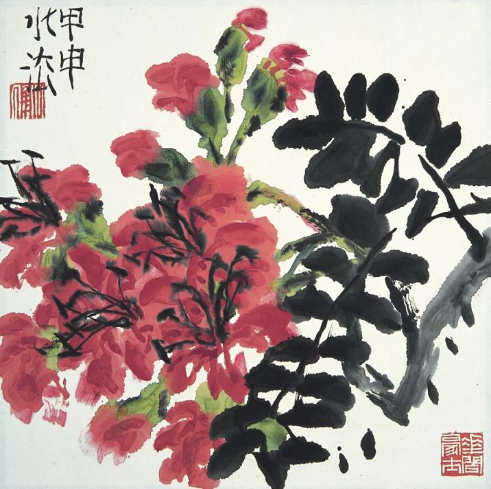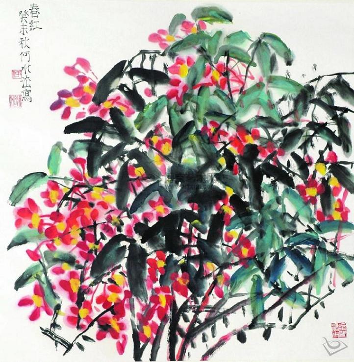 何水法,1946年8月生于杭州,他先后在日本、马来西亚等国家和北京、上海、山东等地举办大型个人画展。出版有《何水法花鸟画集》、《当代最具升值潜力的画家·何水法》等二十余部。何水法曾对两宋的花鸟画作过精深的研究,因此,他的工笔花鸟结构严谨,用笔圆润自如,设色典雅秀逸,写意则受青藤、八大之影响,因而所作写意花鸟气旺神畅,笔墨华滋,浑然天成,厚实灵动,相映成趣。