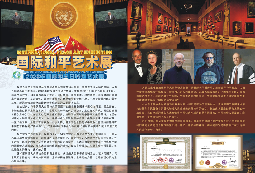 为敦促全球各地区领导人凝聚各方智慧,妥善解决矛盾分歧,维护世界和平稳定,为进一步增强地球村休戚相关、安危与共的共同体意识,为庆祝联合国第21个国际和平日, 美国国家艺术中心、北京艺联诗书画院、中国书法美术研究会、中欧文化交流中心决定隆重在美国纽约隆重举办“国际和平艺术展”。